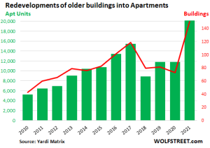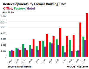 For 2021, a total of 20,122 apartments are expected to be completed, in 151 buildings of all types, with a surging share of office buildings, according to Yardi Matrix data cited by sister company RENTCafé. But it’s not huge: By comparison, new construction starts of multi-family buildings with five or more units averaged around 370,000 units per year over the past five years. The number of completed buildings in 2021, at 151, are over double the number in the prior two years.