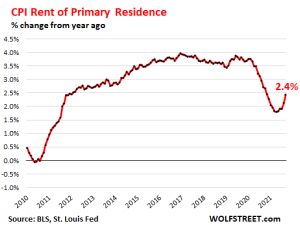 “Rent of primary residence,” which weighs 7.6% in the overall CPI, jumped 0.5% for the month, which brought the year-over-year rise to 2.4%. Before the pandemic, the rent index ran between 3.5% and 4% year-over-year. During the pandemic, it plunged and prevented overall CPI from surging even more. But that phase is now over as surging market rents are gradually getting picked up by the CPI for rent:
