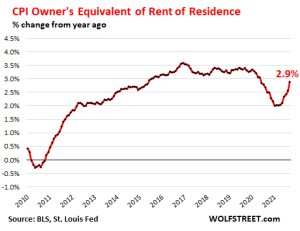 “Owner’s equivalent rent of residences” – which tracks the costs of homeownership and weighs 23.6% in the overall CPI – doesn’t track actual home-price inflation, but is based on surveys that ask what homeowners think their home might rent for and is therefore a measure of rent as seen by the homeowner.