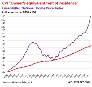 As the index for “Owner’s equivalent of rent” just started budging (red line below), the Case-Shiller Home Price Index, which tracks actual price changes of the same house and is therefore a measure of house price inflation, spiked by 19.7% year-over year, the most in the data going back to 1987 (purple line). Both indexes are set to 100 for January 2000: