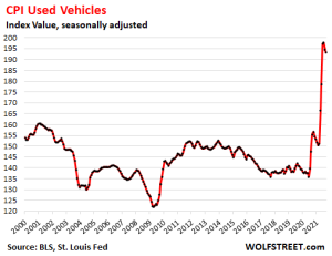The CPI for used cars and trucks fell by 0.7% for the month, the second decline from the ridiculous spike, but was still up by 24.4% year-over-year. This is based on retail prices at dealers.