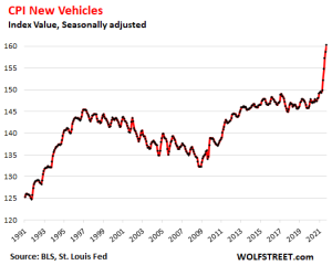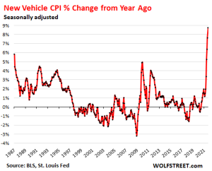 The CPI for new cars and trucks spiked by 1.3% for the month and by 8.8% year-over-year, the most since 1980 during the massive bout of inflation at the time.