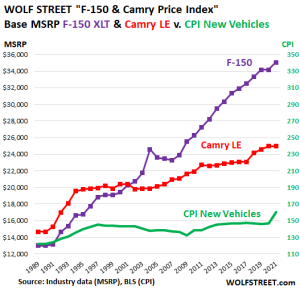 My F-150 and Camry Price Index illustrates how prices have soared, even as the CPI for new cars and trucks (green line) remained nearly flat until the current spike.